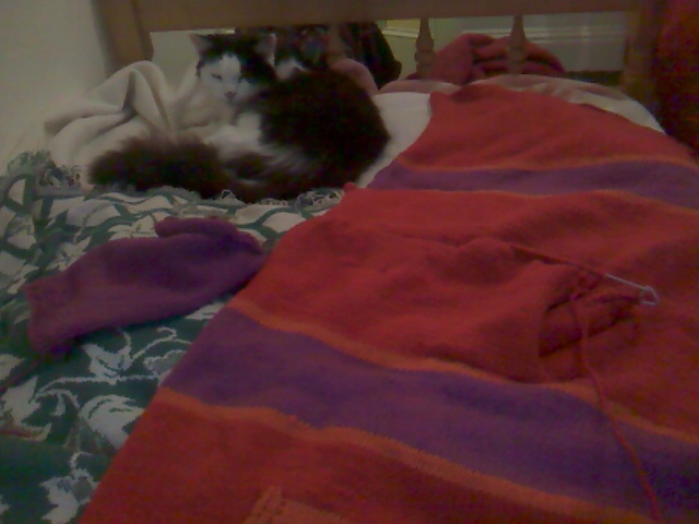 I have completed the back and the front panels, and have sewn the shoulders together. Having decided that hoods just get in the way, I plan to knit a few more lines of collar, then leave off the hood (which means I had enough red wool for the pocket which I did in orange instead just in case! Nevermind.)